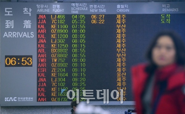 기상악화로 제주공항에 발이 묶였던 여행객들이 항공기 운항이 재개되며 26일 오전 서울 강서구 김포공항에 도착해 국내선 게이트를 통과하고 있다. 노진환 기자 myfixer@
