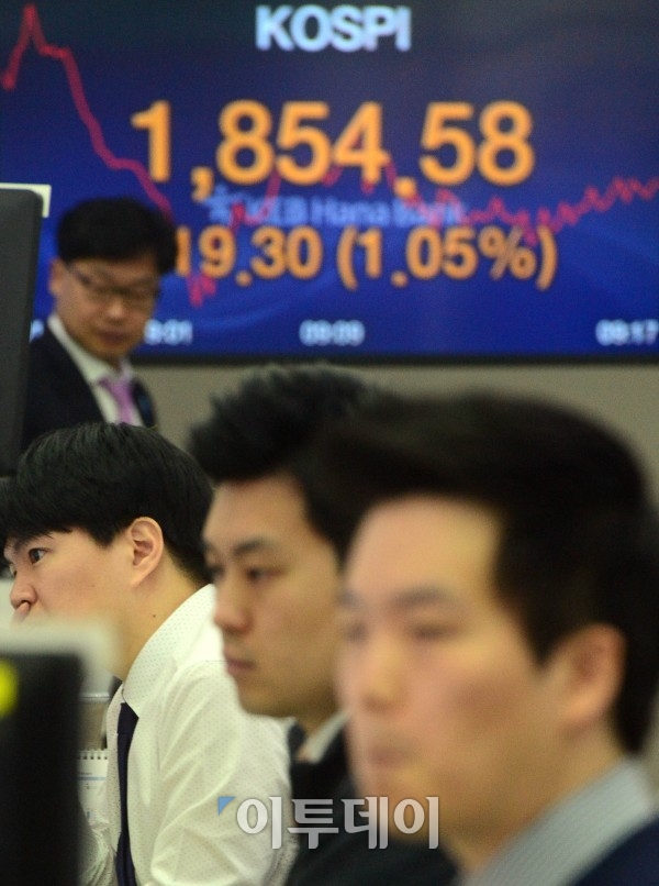 코스피가 국제 유가 급등과 저가 매수에 힘입어 상승세를 보이며 전 거래일보다 22.05포인트(1.20%) 오른 1857.33으로 출발했다. 15일 오전 서울 을지로 KEB하나은행 본점 딜링룸에서 직원들이 업무를 보고 있다. 노진환 기자 myfixer@