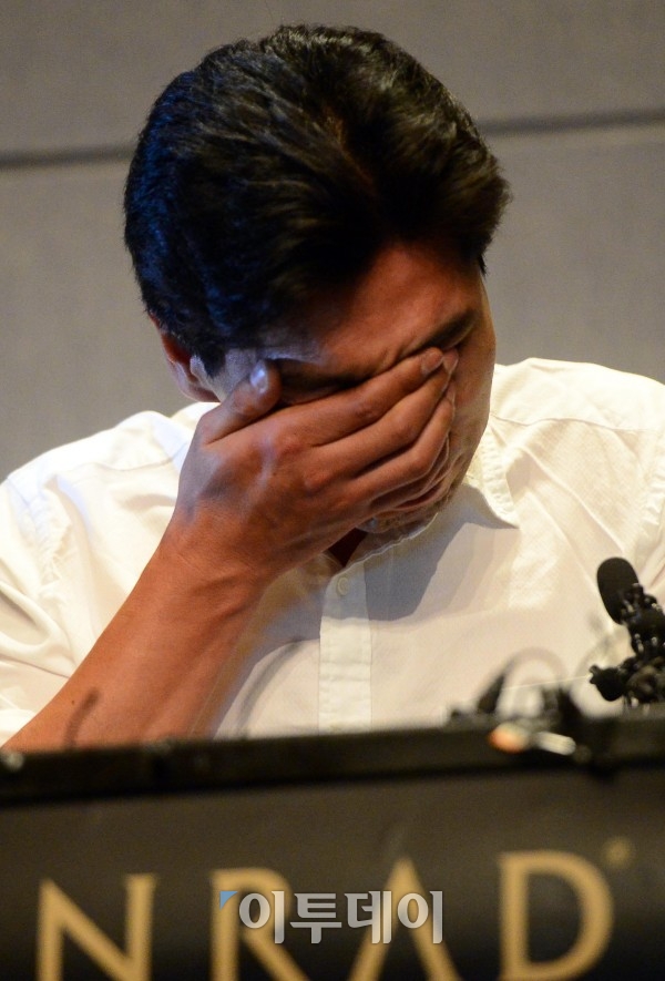 ‘가습기 살균제’ 사건과 관련해 가장 많은 피해자를 발생케 한 옥시레킷벤키저가 2일 서울 영등포구 콘래드호텔에서 기자회견을 가진 가운데 피해자 가족의 아버지가 취재진에게 호소문을 읽으며 눈물을 흘리고 있다. 노진환 기자 myfixer@