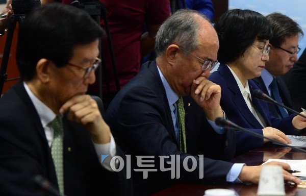 이동걸 KDB산업은행 회장, 이덕훈 수출입은행장, 권선주 IBK기업은행장(왼쪽부터)이 10일 오전 서울 태평로 금융위원회에서 열린 제3차 금융공공기관장 간담회에 참석해 임종룡 금융위원장의 모두발언을 들으며 심각한 표정을 보이고 있다. 이날 열린 간담회에서는 보수 측면의 성과연봉제 도입 동향을 중점 점검하고 교육과 평가 및 영업방식 등 보수 외 분야에 대한 개선방안 등을 논의했다. 노진환 기자 myfixer@