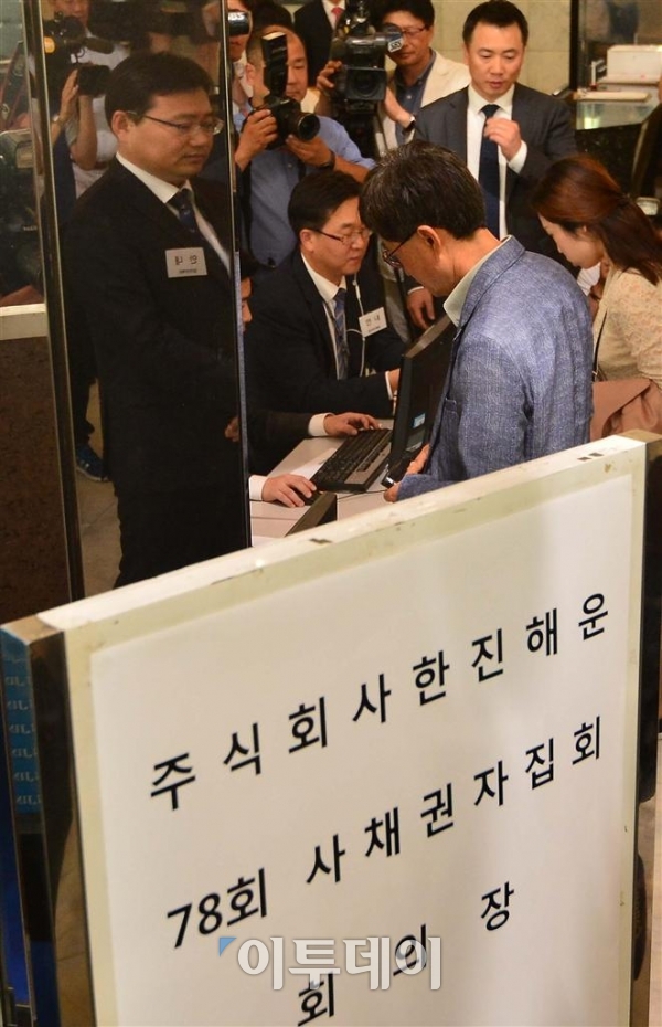 채권단 공동관리에 들어간 한진해운이 채무 재조정을 위한 첫 사채권자 집회를 연 19일 서울 여의도동 본사에서 한 사채권자가 집회 참석을 위해 접수를 하고 있다. 신태현 기자 holjjak@