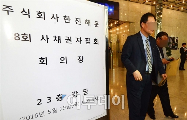 채권단 공동관리에 들어간 한진해운이 채무 재조정을 위한 첫 사채권자 집회를 연 19일 서울 여의도동 본사에서 집회를 마친 사채권자들이 회의장을 나서고 있다. 신태현 기자 holjjak@
