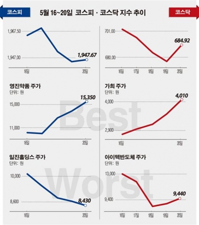 5월 셋째 주(16~20일) 코스피 지수는 전주 대비 0.98%(19.32포인트) 떨어진 1947.67로 마감했다. 코스피 지수는 지난주 5거래일 동안 3일 상승하고 2일은 하락했다. 그러나 미국 금리 인상 가능성과 한국 기업 성장세의 답보 우려 때문에 상승 동력을 받지는 못했다. 전문가들은 코스피 지수가 박스권에 갇힌 흐름을 당분간 이어갈 것으로 내다보고 있다.
