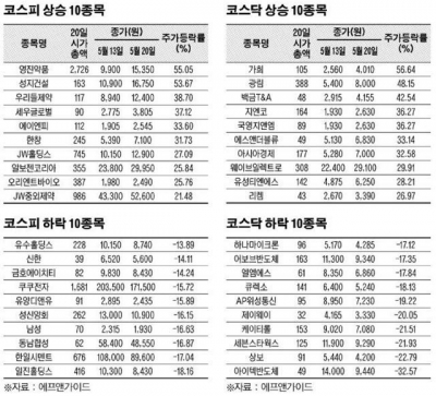 제약주인 영진약품도 지난주 급등세를 보였다. 영진약품은 지난 한 주 동안 55.05% 주가가 오르며 코스피 종목에서 상승률 1위를 기록했다. 영진약품의 주가 상승은 KT&G생명과학과의 합병 때문으로 풀이되고 있다. 이 회사는 KT&G생명과학과 소규모 합병을 결의했고 현재 합병 관련 주요 일정을 진행하고 있다. 또 영진약품의 신약이 오는 하반기 미국 당국의 승인을 받을 것이란 소문도 주가 상승에 영향을 미친 것으로 풀이되고 있다.