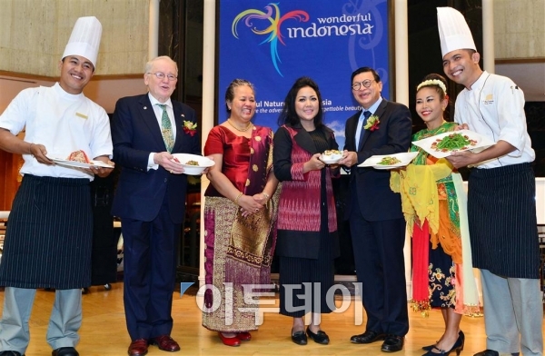 존 프라스티오 주한 인도네시아 대사(오른쪽에서 세 번째)와 번하드 브렌더 그랜드 힐튼 서울 총지배인(왼쪽에서 두 번째)을 비롯한 관계자들이 23일 서울 홍은동 그랜드 힐튼 서울에서 열린 ‘원더풀 인도네시아’ 프로모션 론칭 행사에 참석해 인도네시아 요리를 들어보이고 있다. 그랜드 힐튼 서울은 뷔페 레스토랑 및 에이트리움 카페에서 29일까지 콘래드 발리 호텔&리조트에서 초청한 인도네시아 현지인 셰프 및 댄서들과 함께 이색적인 인도네시아 전통 음식과 흥겨운 전통 춤 공연을 선보인다. 신태현 기자 holjjak@