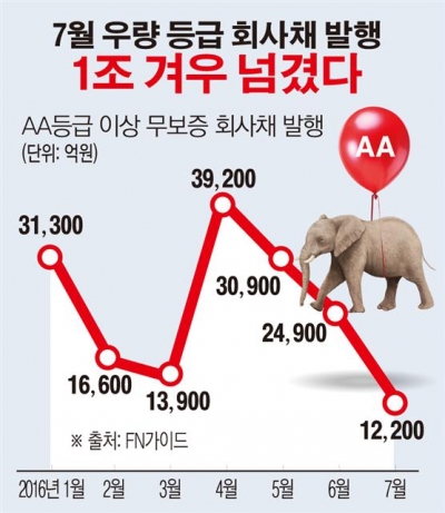 2일 금융정보업체 에프앤가이드에 따르면 7월 한 달간 AA급 이상인 무보증 회사채 전체 발행액은 1조2200억 원이다. 월간 기준으로 올해 최저치다. 지난해 7월(2조7500억 원)과 비교해도 절반에 못 미치는 수준이다.
