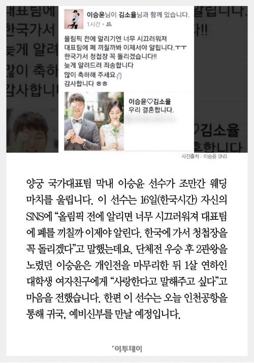 양궁 국가대표팀 막내 이승윤 선수가 조만간 웨딩마치를 울립니다. 이 선수는 16일(한국시간) 자신의 SNS에 “올림픽 전에 알리면 너무 시끄러워져 대표팀에 폐를 끼칠까 이제야 알린다. 한국에 가서 청첩장을 꼭 돌리겠다”고 말했는데요. 단체전 우승 후 2관왕을 노렸던 이승윤은 개인전을 마무리한 뒤 1살 연하인 대학생 여자친구에게 “사랑한다고 말해주고 싶다”고 마음을 전했습니다. 한편 이 선수는 오늘 인천공항을 통해 귀국, 예비신부를 만날 예정입니다.