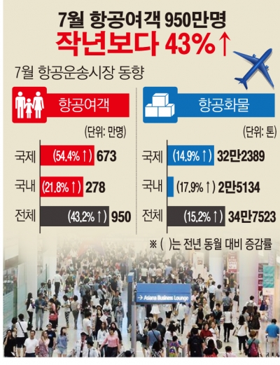 국내외 휴가객이 몰린 7월 항공여객이 950만 명을 기록했습니다. 전년 동월 대비 43.2% 증가했습니다.