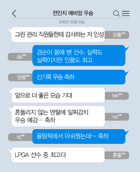 전인지(22·하이트진로) 선수가 미국여자프로골프(LPGA) 메이저대회 에비앙챔피언십에서 우승했습니다. 18일(한국시간) 전인지는 프랑스 에비앙-레-뱅의 에비앙 리조트 골프클럽(파71·6470야드)에서 열린 대회 4라운드에서 최종합계 21언더파 263타로 우승을 거머쥐었습니다. 특히 전인지의 최종 기록은 LPGA와 PGA투어를 통틀어 72홀 최소타 신기록입니다. 전인지는 에비앙 우승으로 지난주 세계랭킹 7위에서 네 계단 뛰어오른 3위로 도약했습니다. 국내 네티즌은 “흔들리지 않는 멘탈” “LPGA 선수 중 최고” 등의 반응을 보이고 있습니다.