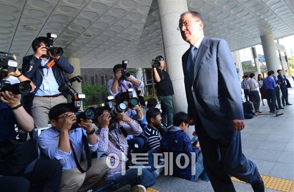 대우조선해양 비리에 연루된 혐의를 받고있는 강만수 전 산업은행장이 19일 오전 서울 서초동 고등검찰청에 피의자 신분으로 출석해 청사로 들어서고 있다. 강 전 행장은 재임 시절 자신의 지인들이 운영하는 업체에 대우조선해양이 연구비를 몰아주도록 압력을 행사했다는 의혹을 받고 있다. 신태현 기자 holjjak@