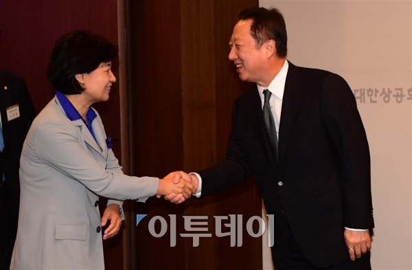 박용만 대한상공회의소 회장(오른쪽)과 추미애 더불어민주당 대표가 19일 서울 여의도 63컨벤션에서 열린 20대 국회의원 환영리셉션에서 악수를 하고 있다. 고이란 기자 photoeran@