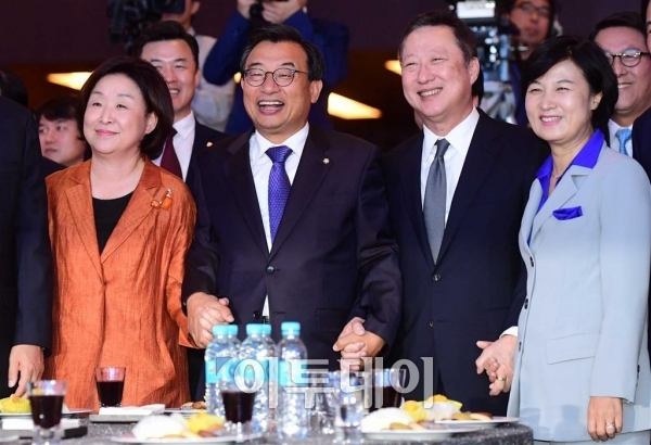 추미애 더불어민주당 대표, 박용만 대한상공회의소 회장, 이정현 새누리당 대표, 심상정 정의당 상임대표(오른쪽부터)가 19일 서울 여의도 63컨벤션에서 열린 20대 국회의원 환영리셉션에서 손을 맞잡고 있다. 고이란 기자 photoeran@