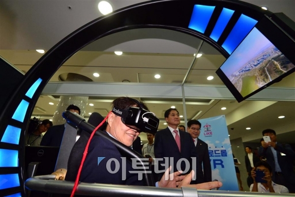 최양희 미래창조과학부 장관이 19일 서울 여의도동 국회 의원회관에서 열린 ‘제4차 산업혁명, 대한민국의 미래를 바꾼다’ 대토론회 참석에 앞서 토론회장 밖에 설치된 가상·증강현실(VR·AR) 부스를 체험하고 있다. 신태현 기자 holjjak@