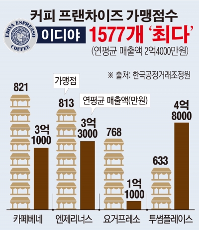 이디야커피는 가맹점 수가 가장 많고, 투썸플레이스는 연평균 매출이 가장 높은 것으로 나타났습니다.