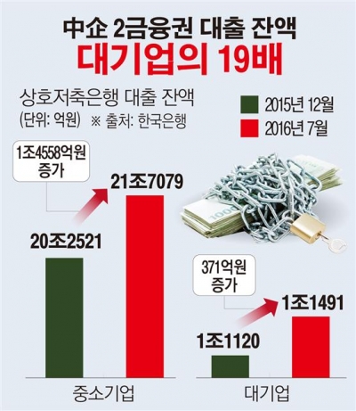 또 다른 2금융권인 상호금융의 대기업 대출금 잔액은 4117억 원 수준인 데 반해 중소기업 대출금 잔액은 32조6059억 원으로 조사됐다