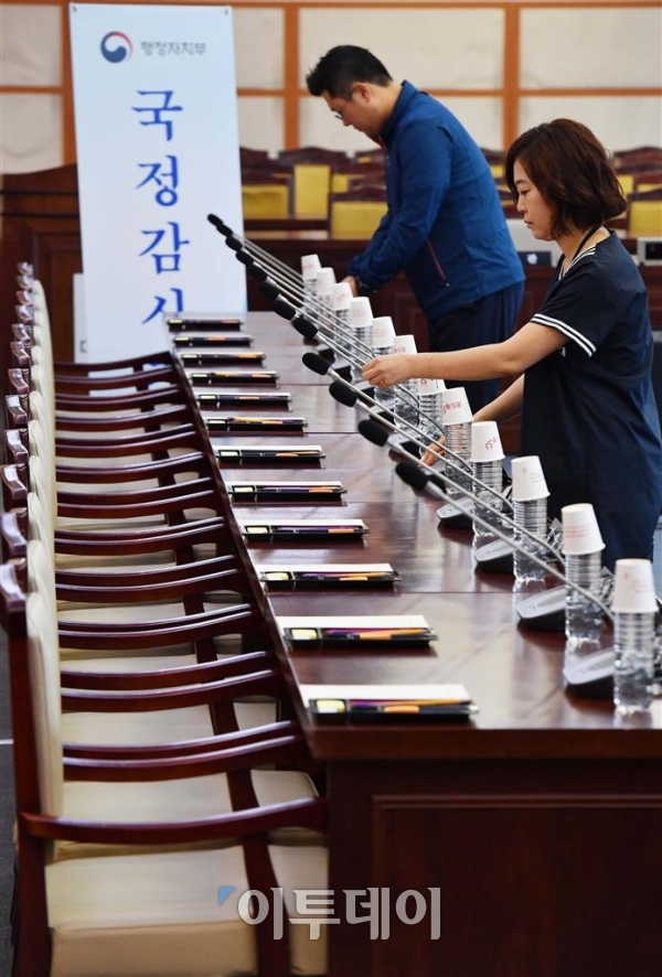 20대 국회 첫 국정감사를 하루 앞둔 25일 서울 세종로 정부서울청사에서 행정자치부 관계자들이 수감준비를 하고 있다. 신태현 기자 holjjak@