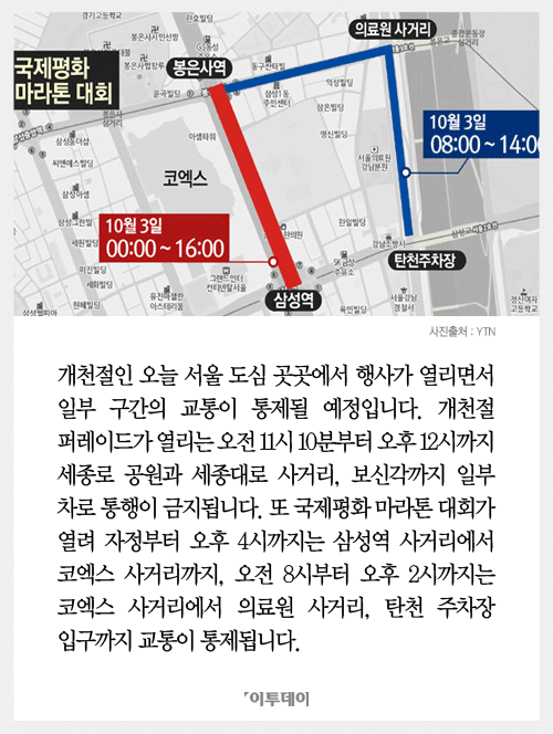 개천일인 오늘 일부 구간의 교통이 통제되는데요. 자세한 교통상황은 서울지방경찰청 교통정보 안내전화(☎ 02-700-5000), 카카오톡(아이디 '서울경찰교통정보'), 교통정보센터 홈페이지(www.spatic.go.kr), 스마트폰 애플리케이션(서울교통상황) 등으로 확인할 수 있습니다.