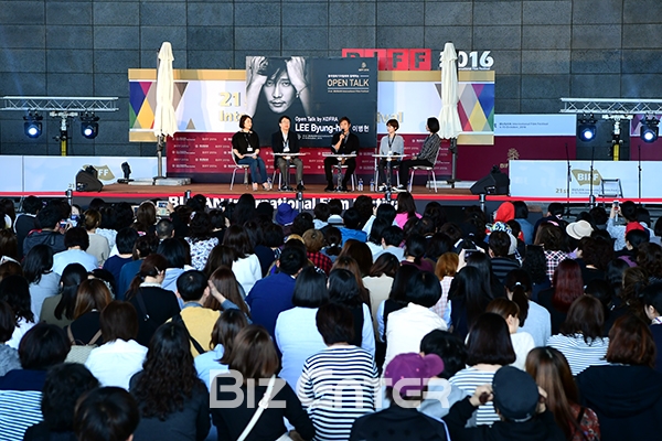 배우 이병헌이 7일 오후 부산 해운대구 우동 영화의 전당 두레라움 광장에서 열린 제21회 부산국제영화제(BIFF) '한국영화기자와 함께 하는 오픈토크-더 보이는 인터뷰'에 참석해 팬들과의 만남을 갖고 있다.