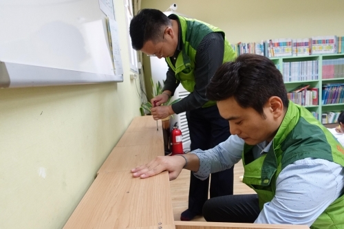 ▲코오롱그룹 임직원들이 7일 단합행사에서 제작한 사물함을 지역아동센터를 찾아 직접 설치하고 있다.(사진제공=코오롱그룹 )