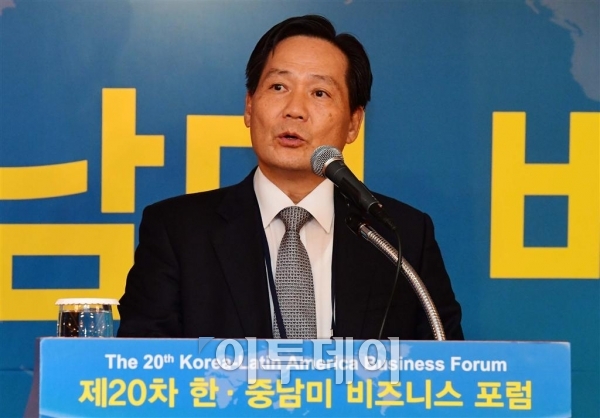 신숭철 한중남미협회 상근부회장이 14일 오전 서울 중구 롯데호텔에서 열린 '제20차 한·중남미 비즈니스 포럼'에서 개회사를 하고 있다. 고이란 기자 photoeran@