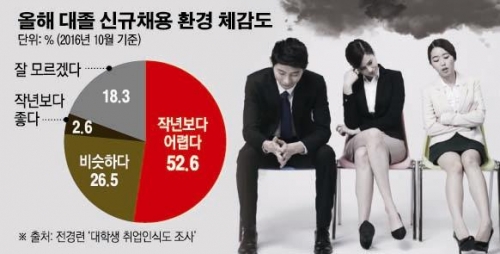 대학생 2명 중 1명은 올해 취업시장이 지난해보다 어렵다고 느끼는 것으로 조사됐다. 전국경제인연합회가 전국 4년제 대학생 3461명을 대상으로 한 ‘2016년 대학생 취업인식도 조사’에 따르면, 올해 대졸 신규채용 환경은 ‘작년보다 어렵다’(52.6%), ‘비슷하다’(26.5%), ‘잘 모르겠다’(18.3%), ‘작년보다 좋다’(2.6%) 순인 것으로 나타났다.