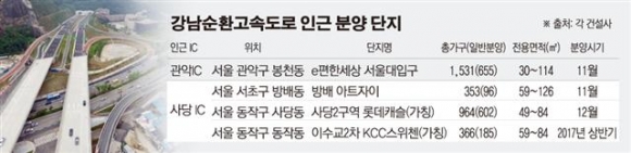 신규 아파트 분양도 준비 중이다. 대림산업은 관악구 봉천 12-2구역을 재개발한 아파트인 ‘e편한세상 서울대입구’를 11월 중 분양할 예정이다. 사당IC 진입이 수월한 서초구, 동작구 일대에서는 GS건설, 롯데건설, KCC건설이 아파트 분양을 준비하고 있다.