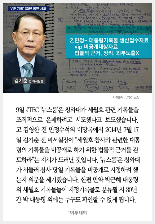 청와대는 세월호 참사 당일 박근혜 대통령의 지시 내용 기록을 한 번도 공개한 적이 없습니다. 이를 두고 시민단체는 공개 요구 소송을 제기한 상태입니다.