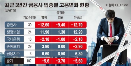 11일 기업경영성과 평가사이트 CEO스코어가 2013년 3분기부터 2016년 3분기까지 은행, 보험, 증권사 등 102개 금융사의 고용현황을 분석한 결과, 3년 사이에 1만2313개의 일자리가 줄어든 것으로 조사됐다.