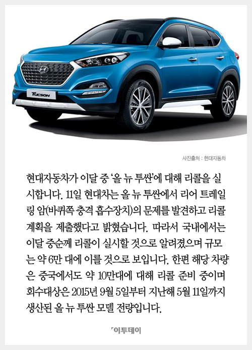 현대차 '올 뉴 투싼'은 지난해 10월에도 일부 제어 장치 오류로 중국 내에서 전량 리콜을 실시했으며 국내에서도 617대를 리콜한 바 있습니다.