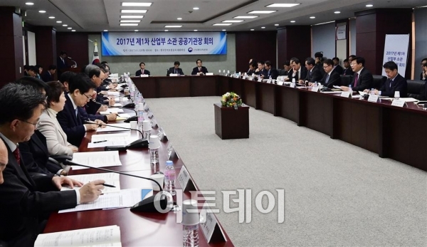 주형환 산업통상자원부 장관이 12일 오전 서울 종로구 무역보험공사 대회의실에서 열린 2017년 1차 산업부 소관 공공기관장 회의에서 모두발언을 하고 있다. 고이란 기자 photoeran@