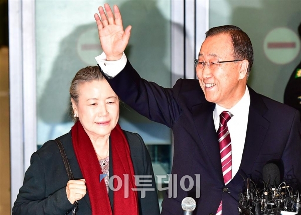 반기문 전 UN사무총장이 12일 오후 10년간의 UN사무총장 임기를 마치고 인천국제공항을 통해 귀국해 손을 흔들고 있다. 이동근 기자 foto@