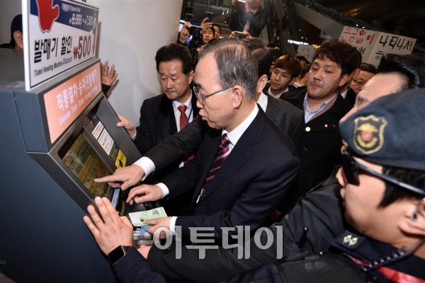 반기문 전 유엔 사무총장이 12일 오후 인천국제공항으로 귀국해 공항철도 탑승을 위해 표를 발권하고 있다. 사진공동취재단
