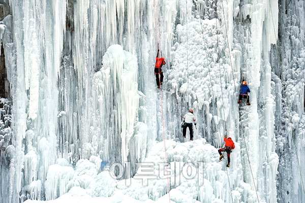 강원 홍천군 내면의 아침 최저 기온이 영하 20.7도를 나타내는 등 전국적으로 올 겨울 최강 한파가 몰아친 15일 강원 원주시 판대아이스파크에서 동호인들이 빙벽타기를 즐기고 있다. 최유진 기자 strongman55@