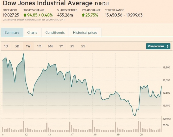 지난 주말(20일) 뉴욕증시에서 주요 지수는 트럼프 대통령 취임 연설 후 일부 정책에 대한 우려로 상승폭이 제한됐다. 다우지수는 전날보다 94.85포인트(0.48%) 상승한 1만9827.25에 거래를 마쳤다. S&P500지수는 전날보다 7.62포인트(0.34%) 높은 2271.31에, 기술주 중심의 나스닥지수는 15.25포인트(0.28%) 오른 5555.33에 장을 마감했다. 주간 기준으로는 3대 지수 모두 하락했다. 다우지수와 나스닥지수는 0.3%, S&P500지수는 0.2% 각각 내렸다. 이로써 다우지수와 S&P500지수는 2주 연속 하락세를 이어갔다. 로이터 조사에 따르면 S&P500지수는 허버트 후버 대통령이 취임한 1929년 이후 새 대통령 취임 후 1개월 간 평균 2.7% 하락하는 경향이 있다.