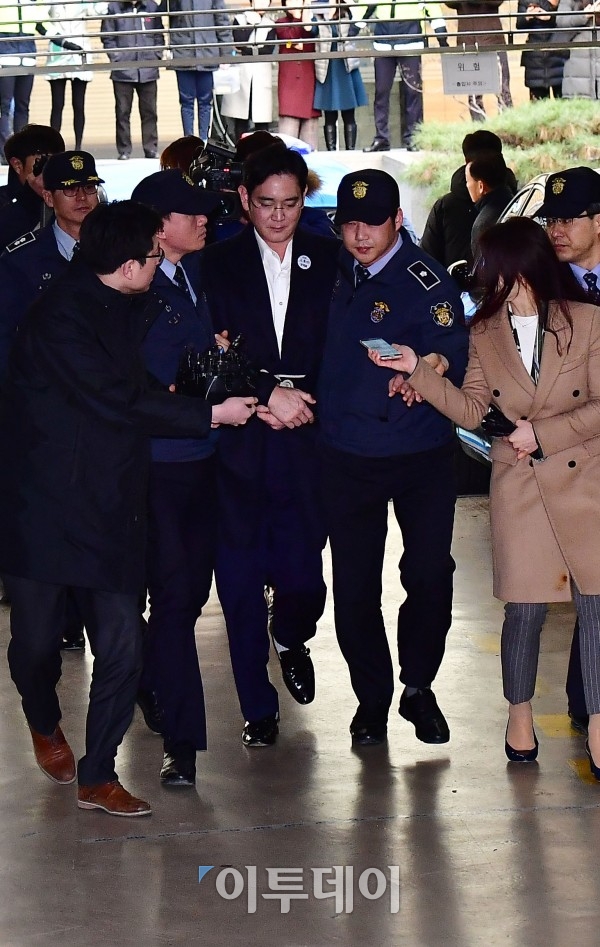 뇌물공여 등의 혐의로 구속영장이 발부된 이재용 삼성전자 부회장이 18일 오후 구속 이후 처음으로 서울 대치동 특검사무실로 소환되고 있다. 이동근 기자 foto@