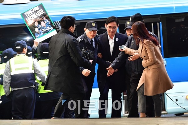 뇌물공여 등의 혐의로 구속영장이 발부된 이재용 삼성전자 부회장이 18일 오후 구속 이후 처음으로 서울 대치동 특검사무실로 소환되고 있다. 이동근 기자 foto@