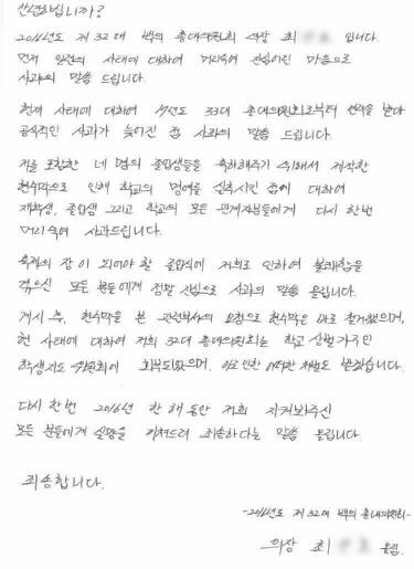 단국대 총대의원회는 24일 페이스북 '단국대학교 대나무숲'에 "2016년 제 32대 백의 총대의원회 의장 최○○입니다. 먼저 일련의 사태에 대하여 머리를 숙여 진심 어린 마음으로 사과의 말씀을 드립니다"라고 자필 사과문을 올렸다.