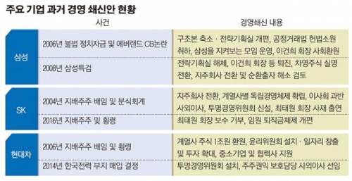 최순실 국정농단 사태로 지배구조 개선과 정경유착 근절 등 재벌 개혁에 대한 사회적 요구가 높아지고 있는 것은 기업 스스로의 개혁이 미흡한 것도 한 원인이다. 과거 삼성, 현대차, SK그룹 등은 총수 등의 불법 행위로 기업의 이미지가 훼손되었던 시점에 갖가지 쇄신책과 지배구조 개선책을 발표했다. 그러나 진정성 있는 질적 변화를 꾀하지 못했다는 평가를 받고 있다.