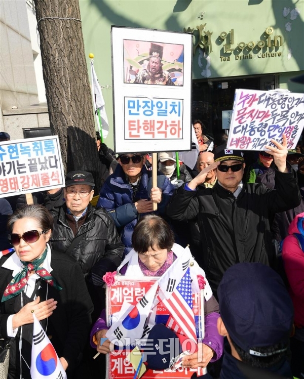 박근혜 대통령 탄핵심판의 마지막 변론일인 27일 서울 종로구 헌법재판소 앞에서 보수단체들이 탄핵반대 집회를 하고 있다. 고이란 기자 photoeran@