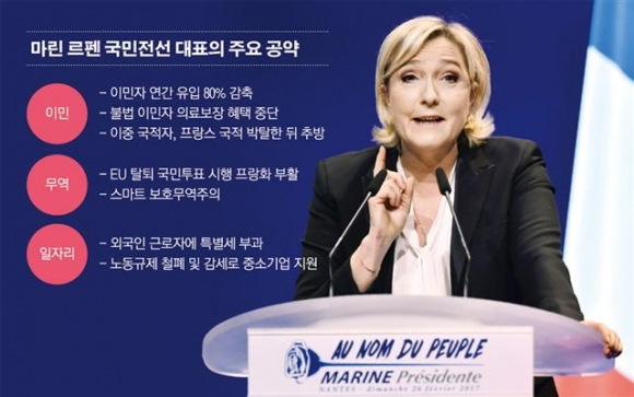 ◇ 제2의 메이 될까= 2011년 국민전선을 창설한 장 마리 르펜으로부터 당수 자리를 이어받을 때만 해도 르펜은 ‘극우 인종차별주의자’에 불과한 인물이었다. 하지만 경기 침체와 높은 실업률, 잇단 테러로 극우 정당의 목소리에 귀 기울이는 사람들이 늘어났고 르펜은 반이민 정책과 반유럽 정책을 앞세워 지지 기반을 넓혀가고 있다. 르펜 대표는 이 여세를 몰아 4월 1차 투표를 통과해 결선투표에 진출할 것으로 전망되고 있다. 프랑스 대선은 1차 투표에서 과반 득표자가 없을 경우 1·2위 득표자가 결선투표를 해 대통령을 결정한다. 르펜은 프랑스가 처한 암울한 현실을 타개하려면 프랑스의 유럽연합(EU) 탈퇴 ‘프렉시트(Frexit)’가 필요하다고 주장한다. 이에 자신이 당선되면 프렉시트를 추진하겠다고 공약했다. 브렉시트(영국의 유럽연합(EU) 탈퇴)를 이끈 테리사 메이 영국 총리를 본보기로 삼겠다고도 했다. 그는 유로존 탈퇴를 통해 엄격한 이민 제한과 스마트 보호무역주의(smart protectionism)를 펼쳐 ‘번영의 길’로 나아가겠다고 강조했다. 르펜은 유로화가 독일에선 저평가됐으나 프랑스에서는 과대평가됐다며 프랑스가 경쟁에서 불리한 입장이라고 주장한다. 이에 유로화를 버리고 과거 자국 통화였던 프랑화를 부활시켜야 한다고 주장하고 있다. 르펜은 “영국 경제는 파란불 일색이다. 대혼란을 예측한 사람들은 상황을 오판했다”며 “실업률도 브렉시트 투표 이후 더 떨어졌고, 성장률은 오히려 상승했다”고 말했다. 프랑스는 영국과는 달리 유로존(유로화 사용 19개국) 회원국이다. 프랑스의 EU 탈퇴는 유로존 체계를 뒤흔들 수밖에 없는 사안이다.