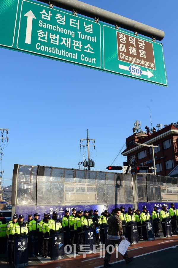 박근혜 대통령 탄핵심판 사건 선고일인 10일 오전 서울 종로구 헌법재판소 인근의 경계가 강화된 가운데 안국역 사거리에서 경찰들이 경계근무를 서고 있다. 이동근 기자 foto@