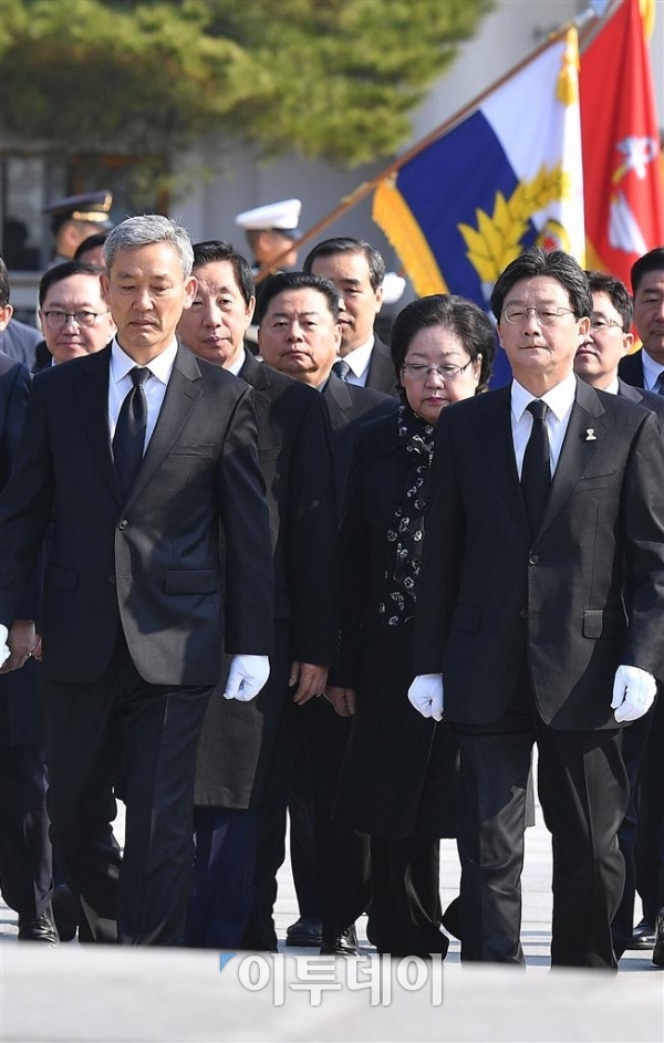 19대 대통령 선거 바른정당 유승민 후보가 29일 오전 공식 첫 행보로 서울 동작구 국립서울현충원을 참배하고 있다. 유 후보는 전날 서울 송파구 올림픽공원에서 열린 후보선출대회에서 당원 선거인단과 국민정책평가단 투표, 일반 국민 여론조사 등을 합산한 결과 총 3만6593표(62.9%)를 얻어 2만1625표(37.1%)의 남경필 경기지사를 여유있게 꺾었다.