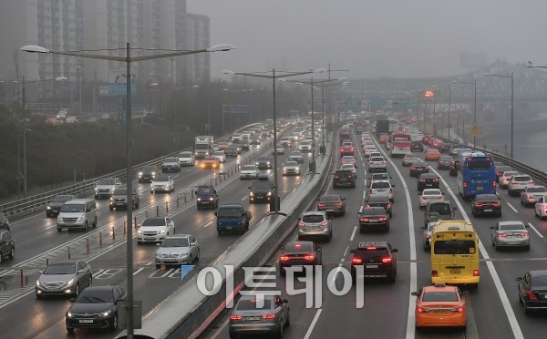 전날부터 내린 비의 영향으로 중부지방에 짙은 안개가 낀 6일 오전 서울 올림픽대로에서 차량들이 서행하고 있다. 이동근 기자 foto@
