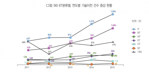 산학협력종합지원센터에 따르면 2015년 기준 국내 전체 대학의 기술이전계약 건수는 4017건으로 전년 대비 23.1% 증가했으며, 2011년 이후 연평균 증가율은 19.1%인 것으로 나타났다. 특히 6T(IT, BT, NT, ET, ST, CT) 별 산학협력 기술이전 건수 중 IT(정보기술) 1504개를 제외하고, BT(생명공학기술) 1084개로 가장 많았고, 그 다음 ET(환경공학분야) 324개, NT(나노기술)가 674개 순으로 많았다.