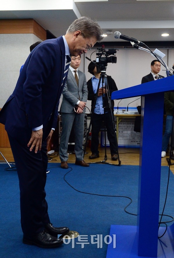 더불어민주당 문재인 대선후보가 24일 서울 여의도 중앙당사에서 주택정책 공약발표 후 고개숙여 인사하고 있다. 이동근 기자 foto@