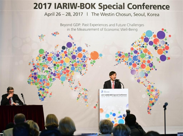 이주열 한국은행 총재가 26일 오전 서울 소공동 웨스틴조선호텔에서 열린 '국제 소득과 부에 관한 학회(IARIW)'에서 개회사를 하고 있다. 이날 이 총재는 "GDP를 통해 물적, 양적 성장을 정확히 측정해 나가는 한편 GDP가 포착하지 못하는 삶의 질도 균형 있게 측정하는데 더욱 힘써야 할 시점"이라고 말했다. 고이란 기자 photoeran@