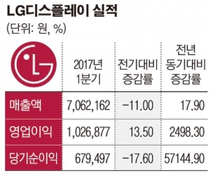 매출액은 7조621억 원으로 전년 동기 대비 17.9% 늘었으나 전분기보다는 11.0% 감소했다. 지난해 4분기보다 매출 규모가 줄어든 까닭은 조업 일수가 감소하고 신제품 연구개발(R&D) 투입 등으로 출하 면적이 줄었기 때문이다. 모바일 비중이 떨어진 것도 매출액 감소의 원인으로 풀이된다.