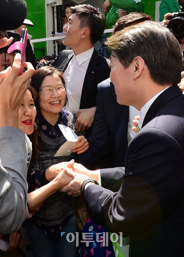 국민의당 안철수 대선후보가 26일 강원 춘천시 낭만시장에서 거리유세를 펼치며 시민들과 인사하고 있다. 이동근 기자 foto@