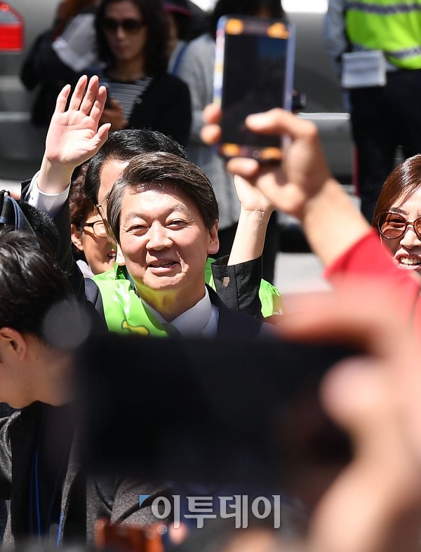 국민의당 안철수 대선후보가 26일 강원 춘천시 낭만시장에서 거리유세를 펼치며 시민들을 향해 손을 흔들고 있다. 이동근 기자 foto@