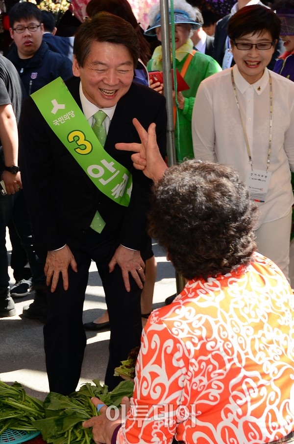 국민의당 안철수 대선후보가 26일 강원 원주시 중앙시장에서 거리유세 중 한 상인이 손가락 세개를 펼쳐 보이자 환하게 웃고 있다. 이동근 기자 foto@